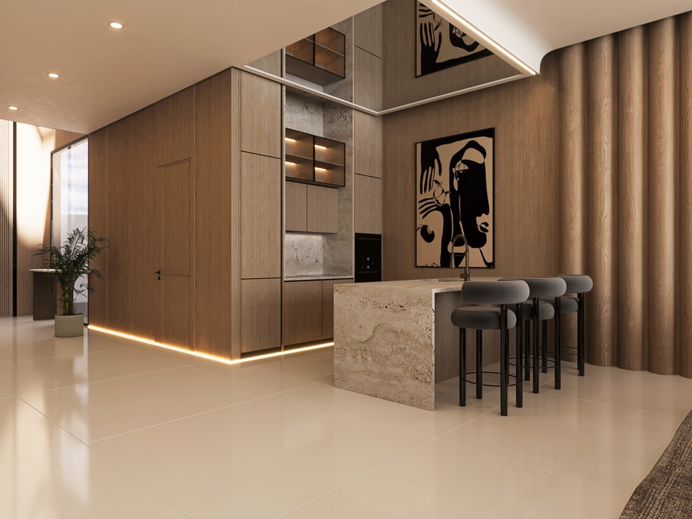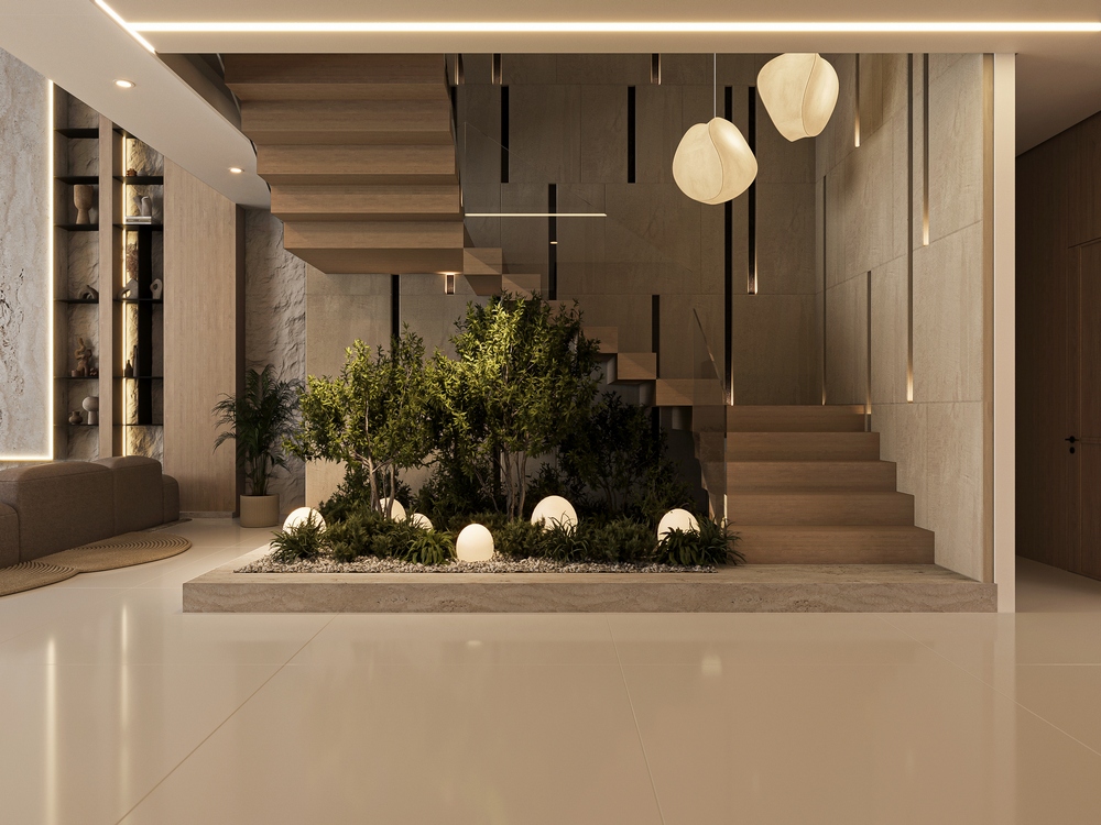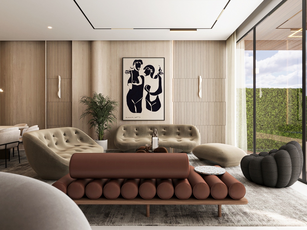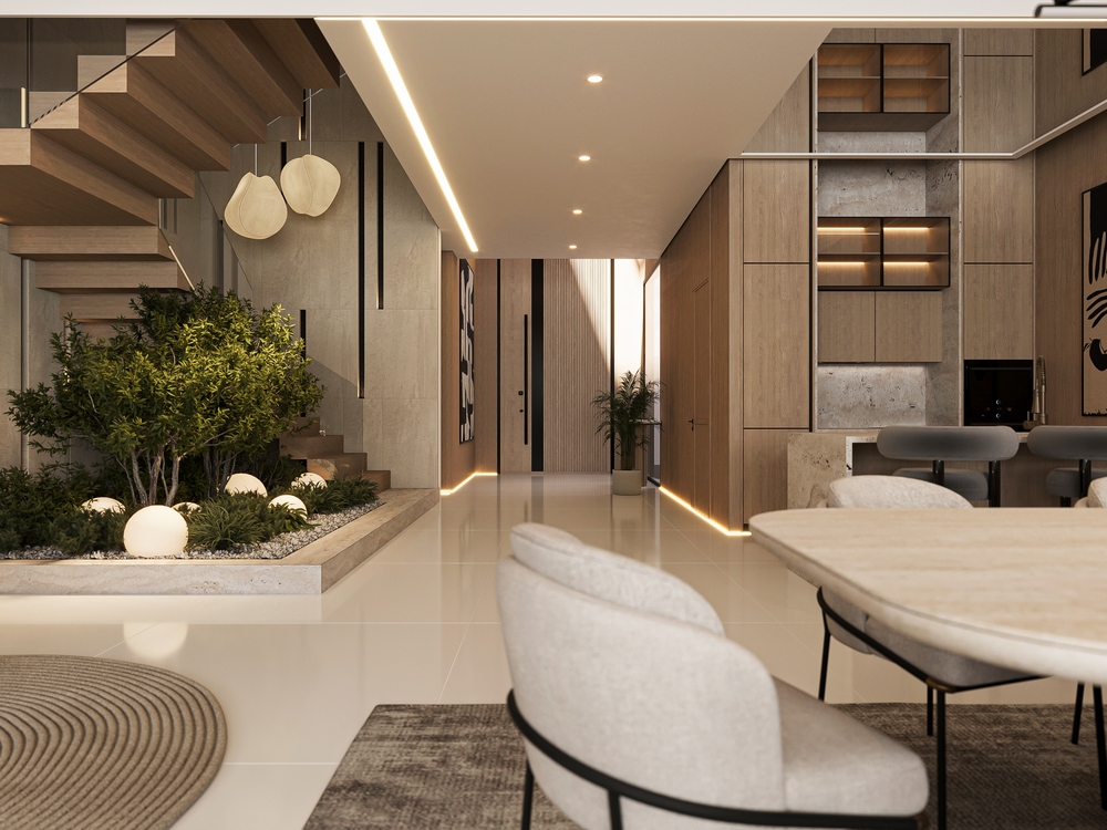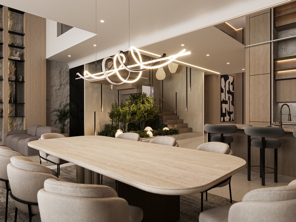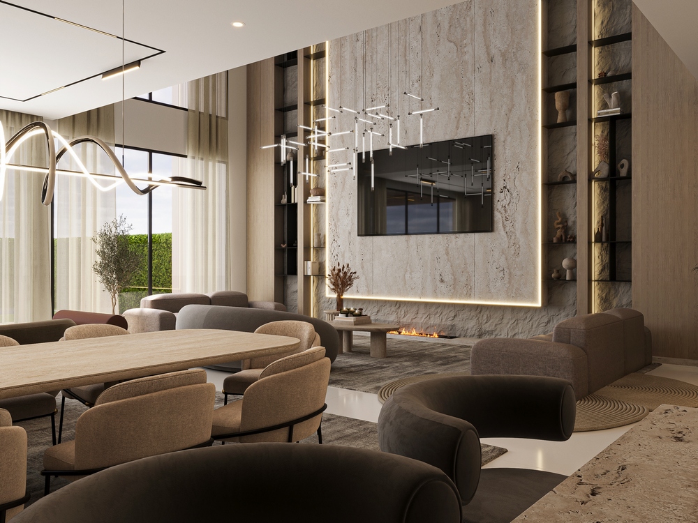 Grand salon contemporain en double hauteur mêlant élégance et confort : canapés aux lignes organiques, table sculpturale, vaste tapis texturé et banquette design. Les panneaux de chêne rainuré et les touches pierre soulignent une palette naturelle et chaleureuse. La suspension sculpturale et les gorges LED dessinent l’ambiance, tandis que l’escalier flottant et la mezzanine ouvrent la perspective sur la salle à manger. Végétation indoor, finitions soignées et lumière abondante complètent cet espace haut de gamme.